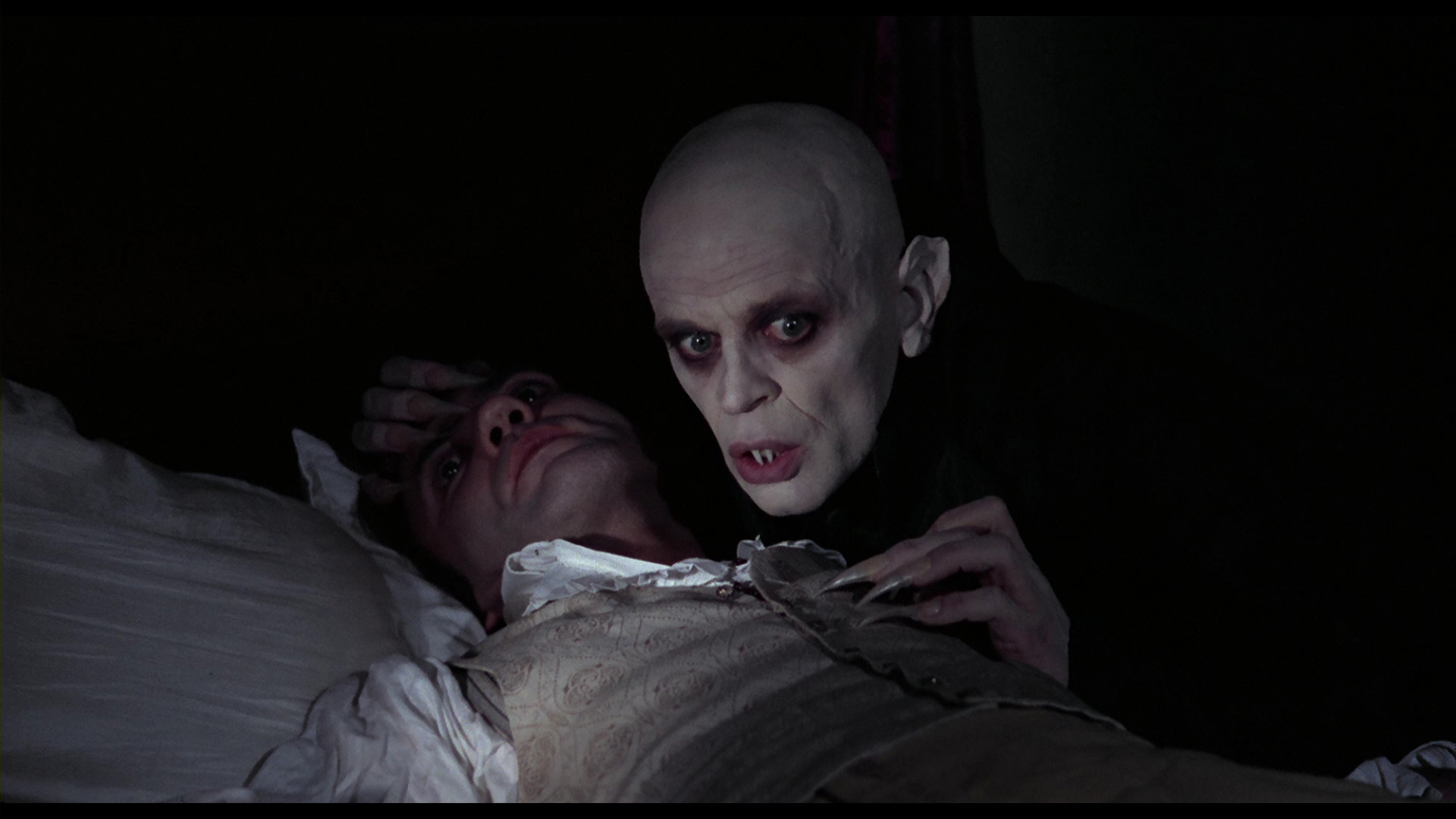 El guión de Nosferatu, vampiro de la noche, tuvo pocas modificaciones de su versión original y tanto la estética como la iluminación mantienen esa ilusión de expresionismo clásico. El film de Herzog se desarrolla en un ambiente fantasmagórico, onírico, ideal para contar una vez más la historia del vampiro de vampiros (el cual vuelve a llamarse Drácula por un tema de caducidad de derechos de autor), desde una perspectiva más romántica, haciendo énfasis en la terrible soledad y el dolor de la vida decadente de un ser inmortal. La película está plagada de personajes extraños y miserables como Renfield, el jefe de Jonathan Harker (Bruno Ganz), interpretado por Roland Topor. La atmosfera apocalíptica que se respira en Wismar tras la llegada del conde Drácula es agobiante. La peste hace estragos entre los ciudadanos y Herzog decide mostrarlo desde unos imponentes planos cenitales que exponen una ciudad depresiva, donde los personajes son pálidos y tristes, verdaderos hombres grises, y un sol que nunca termina de salir, un astro rey que parece tener miedo de asomarse en aquella funesta ciudad, excepto en el clímax del film cuando refulge con fuerza arrolladora para llevar a cabo un cometido mucho más intenso que alumbrar y dar calor: matar al vampiro. El sol dador de vida se pone el traje de parca para quitarle la esencia vital a un ser inmortal, que para vivir necesitaba absorber la esencia y segar la existencia de otras personas. Linda paradoja.