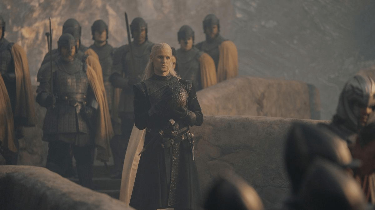 En cuanto a la trama, bueno, lo que temíamos. El príncipe Daemon roba un huevo de dragón con la excusa de ponerlo en la cuna de un hijo que, no solo no ha nacido, sino que no ha sido engendrado. Luego lo devuelve sin escaramuzas. El prodigio, el truco de magia, es que la escena central del capítulo, el encuentro en la escalinata de Rocadragón, es verdaderamente buena: funciona aun cuando no debe funcionar. ¿A qué me refiero con esto? Es bastante fácil. ¿Para qué se roba el huevo Daemon? Es evidente que tenía toda la intención de devolverlo. Lo lleva con él a las escalinatas. Estaba esperando a su hermano. Viserys no viene, y entonces está preparado para cocinar a Otto Hightower y a sus soldados sin miramientos. Aparece Rhaenyra con su dragón y su encanto juvenil y desescala la situación. Daemon devuelve el huevo. La nada misma. Pero al menos es un anticipo de lo que viene para quienes no leyeron Fuego y sangre.
