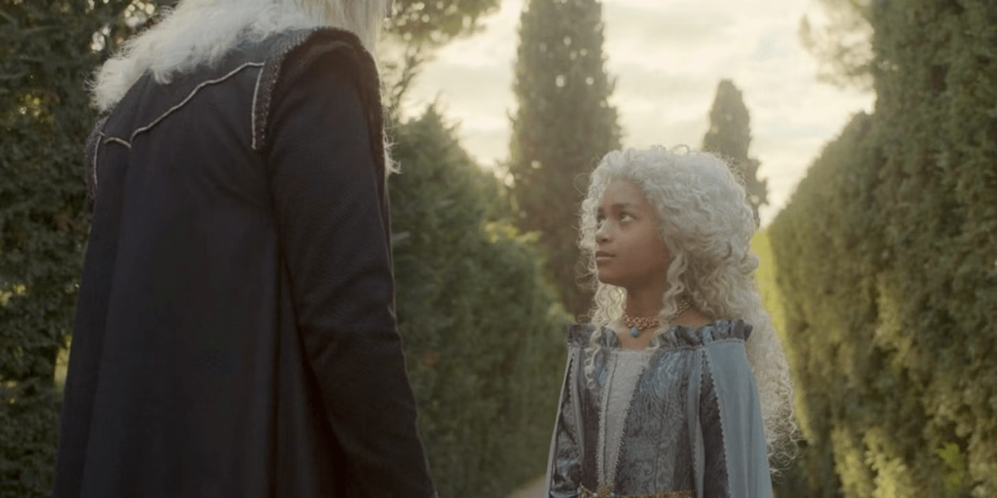 Está obligado a tomar una nueva esposa y tener más hijos para asegurar el trono. Las opciones que se presentan son la obvia y la oculta. La hija de 12 de años de Corlys Velaryon es la opción que asegura la lealtad de la Reina que no fue (Rhaenys) y de la casa Velaryon, la más rica del reino en ese momento. El rey elige tomar por esposa a la hija de su Mano, Alicent Hightower, más crecidita que la niña Velaryon. Está opción, puesto que está obligado, es la más decente.