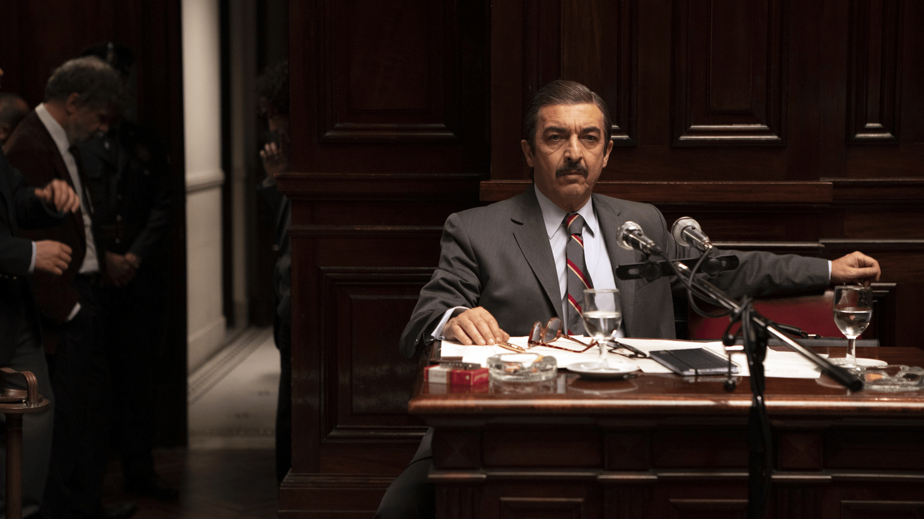 Ricardo Darín da vida a Julio César Strassera, el fiscal del juicio y una figura compleja del mundo político argentino. Strassera fue funcionario judicial durante la dictadura y sobre él pesaban ciertos reclamos de familiares respecto al trámite por aquel entonces de los habeas corpus de las personas desaparecidas. Luego de su participación en el Juicio a las Juntas, el fiscal se encolumnó al interior del movimiento de derechos humanos, participando de la Asamblea Permanente por los Derechos Humanos (APDH). Su sidekick, Luis Moreno Ocampo, interpretado por Peter Lanzani, era en ese entonces un joven abogado empleado de la Procuración General de la Nación, que provenía de una familia de militares. Luego del Juicio a las Juntas tuvo actuación en otros casos resonantes vinculados con la dictadura y los levantamientos carapintadas. Después de eso renunció a la justicia, ejerció la profesión liberal y llegó a conducir “Forum”, una suerte de reality show donde las personas dirimían conflictos de convivencia y vecindad. En 2003 fue nombrado como el primer Fiscal General de la Corte Penal Internacional, cargo que mantuvo hasta 2012, con algunas polémicas. Su última aparición pública resonante en el país se dio en marzo de 2016, cuando Jaime Stiuso lo “apretó” en vivo durante una emisión de Intratables.