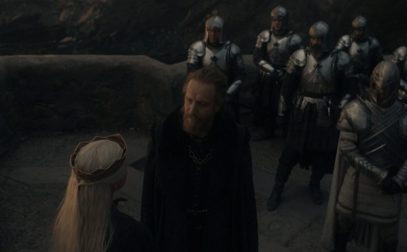 Siguiendo los sucesos del El concilio verde, en La reina Negra Rhaenys llega a Rocadragón a lomo de Meleys. Allí, y para que no queden dudas, explica por qué no dracareó a medio mundo en la coronación de Aegon: “no me corresponde a mi empezar esta guerra”.