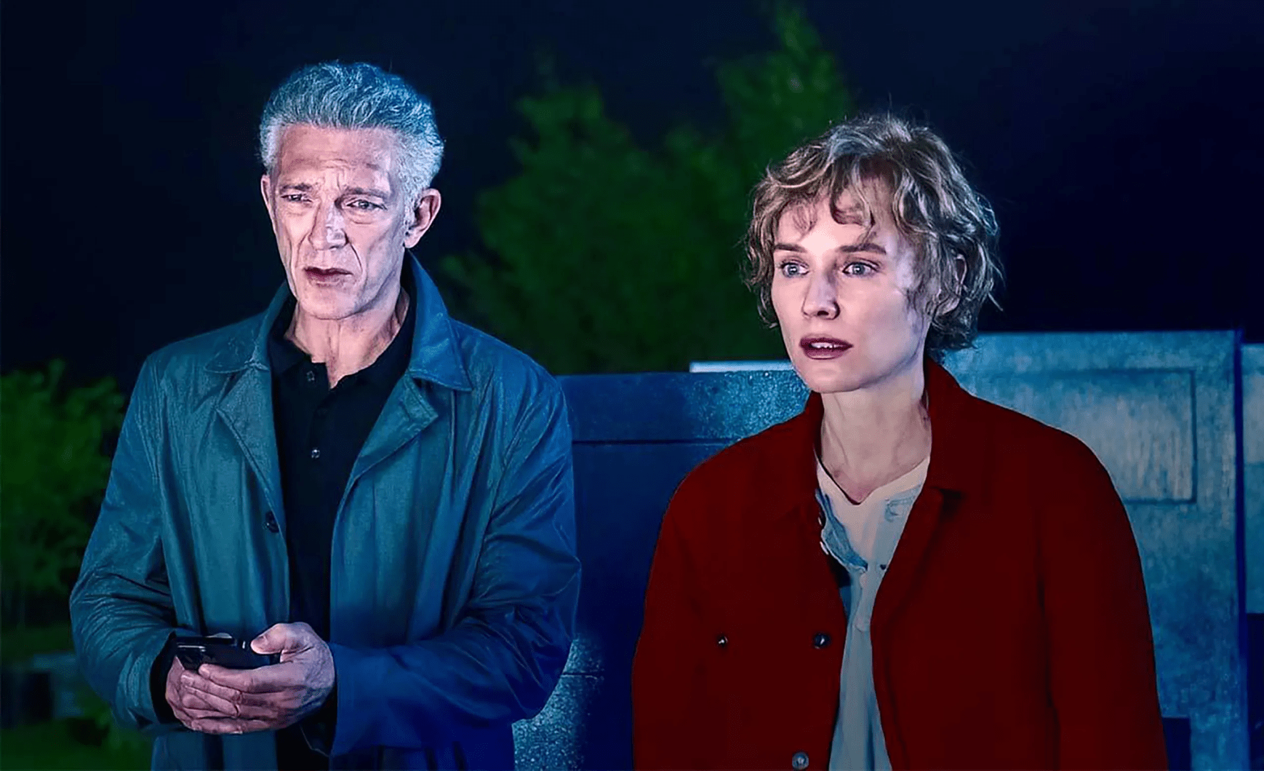 Pero no solamente tenemos una historia de marcado perfil biográfico (Cassel emula algunos rasgos estéticos de Cronenberg), sino que The Shrouds por momentos busca hacer una relectura condensada de Vertigo (1958), la obra magna de Alfred Hitchcock donde la cuestión principal es la fascinación que desarrolla el personaje de James Stewart por perpetuar la imagen de la fallecida que encarna Kim Novak. En este caso le toca a Diane Kruger personificar a la difunta Becca y a su hermana gemela Terry, quien todavía mantiene un vínculo cercano con Karsh. En consecuencia, aparece el recurso de las dualidades y la presencia de una necrofilia sugerente.